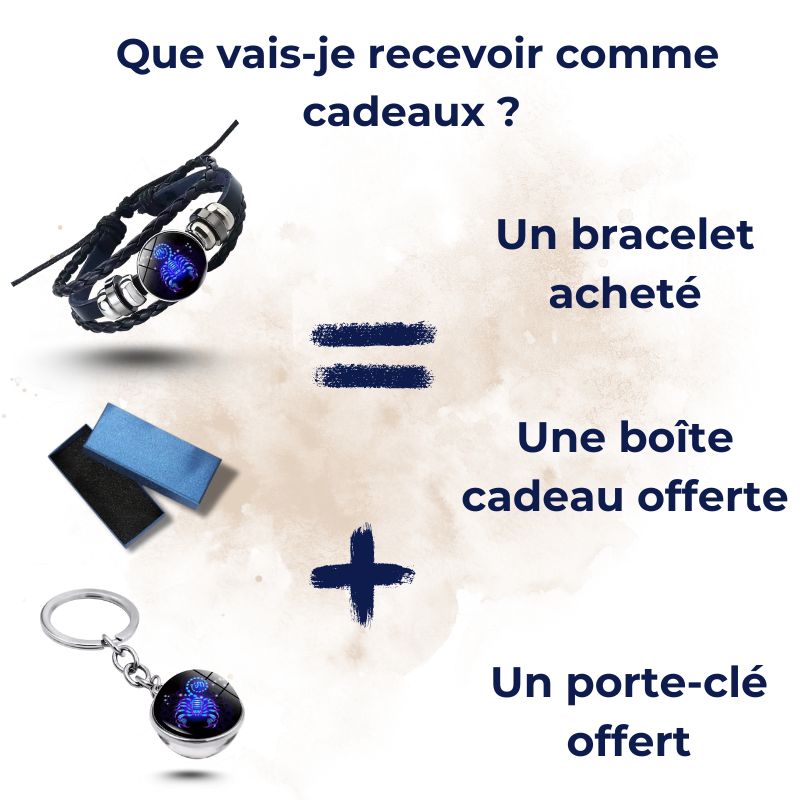 Nous vous offrons un porte-clé avec votre signe astrologique ainsi qu'une boîte cadeau pour offrir et/ou pour ranger votre bracelet Autelmoon.
